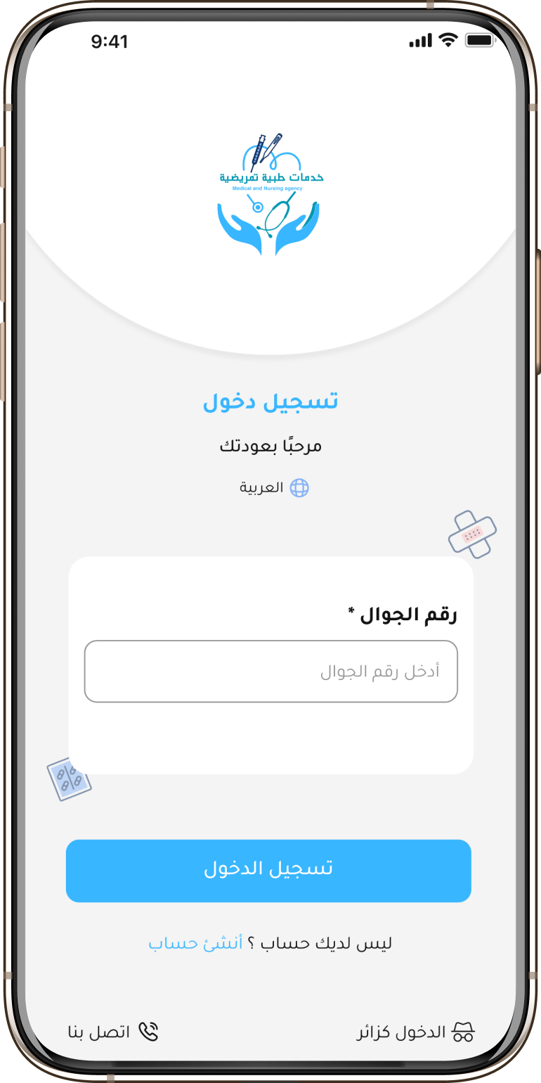 نحن تطبيق رائد في مجال الخدمات الطبية والتمريضية، نسعى لتسهيل وصول الأفراد والعائلات إلى الرعاية الصحية الموثوقة بخطوات بسيطة وسريعة. يجمع تطبيقنا بين الكوادر الطبية المؤهلة والتقنيات الحديثة لتقديم خدمات منزلية وتمريضية متكاملة، بما يضمن راحة المرضى وطمأنينة ذويهم. رؤيتنا أن نكون الخيار الأول لكل من يبحث عن خدمة صحية آمنة وموثوقة في متناول اليد.
